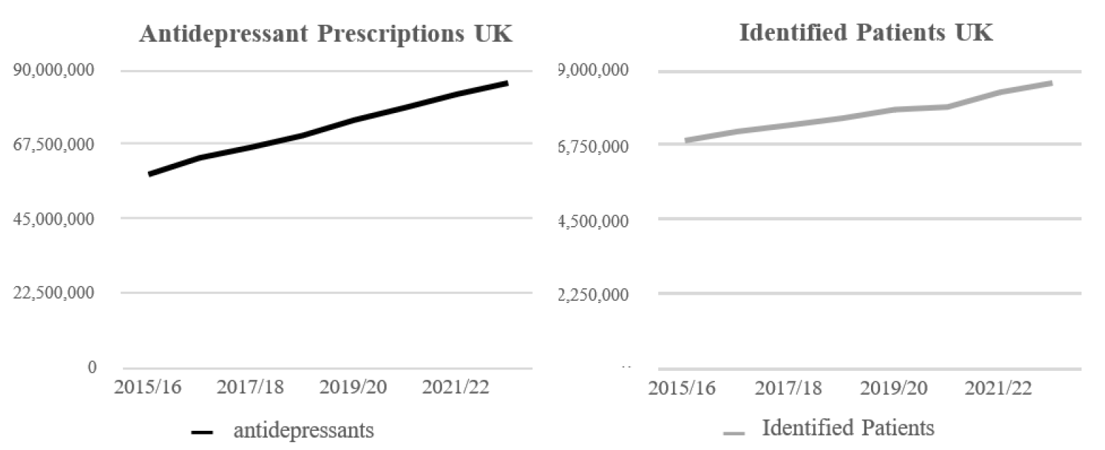 The British Medical Journal suggests over the past decade, antidepressant prescriptions have almost doubled in England (Leung & Chu, 2023), rising to 85.6 million in 2022-23. Over 8.6 million adults in England (nearly 20% of adults) are now prescribed them annually. Those aged 50 – 55 years are the highest users of antidepressants. Finally, the average duration of time for which a person takes an antidepressant has doubled, with around half of the patients now classed as