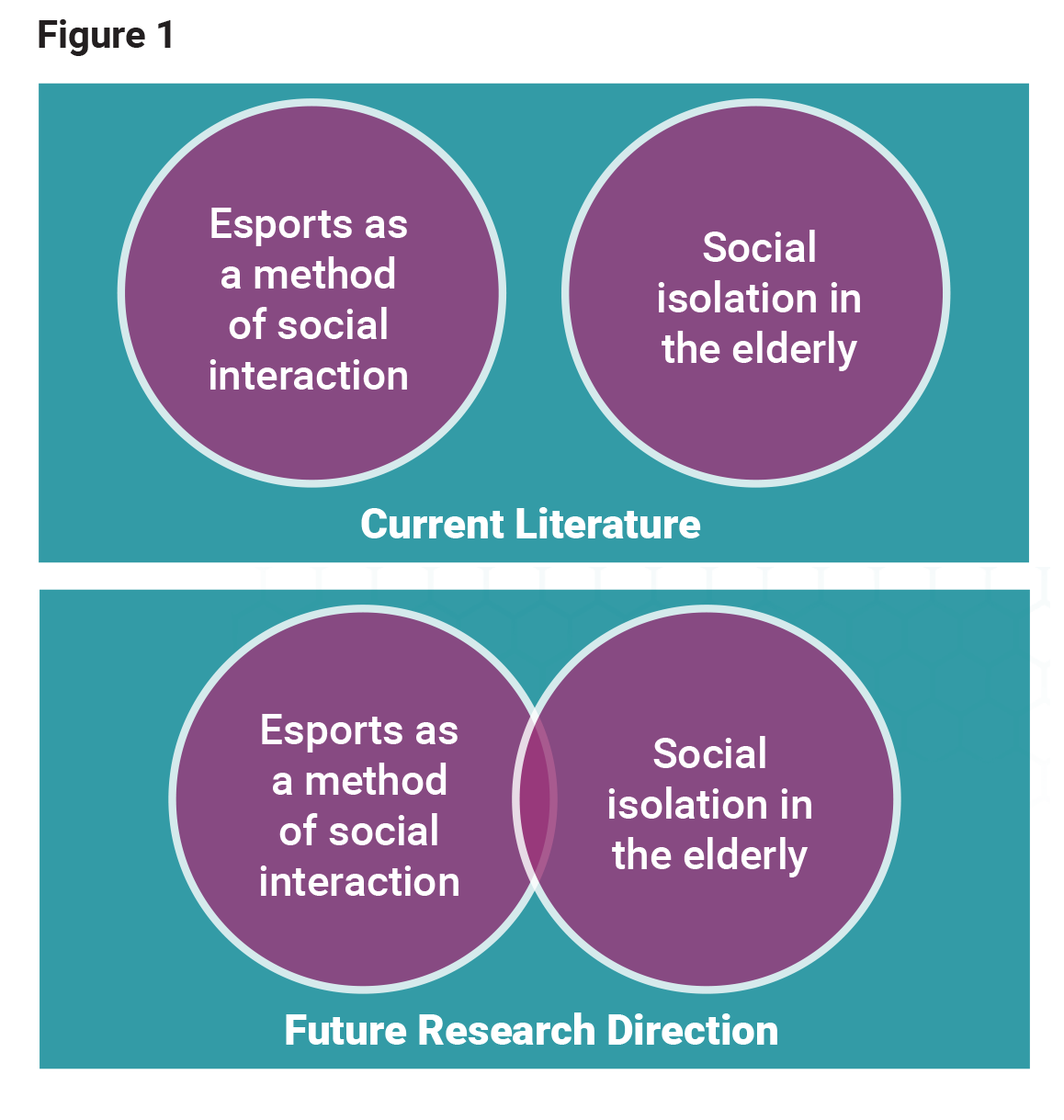 Importantly, as the paper is inherently gerontological in nature, it’s important to consider that this area is intently cross-disciplinary in nature and the impact that has on research is immense, meaning that this review could not possibly cover the full scope of the both esports as a social intervention tool for isolation and for social isolation in elderly people, as both research spheres are currently entirely separate. The following item outlines visually how this research review considers these two spheres of investigation, in terms of where the literature currently stands (left) vs where we hope it to be in the next 2-3 years (right):